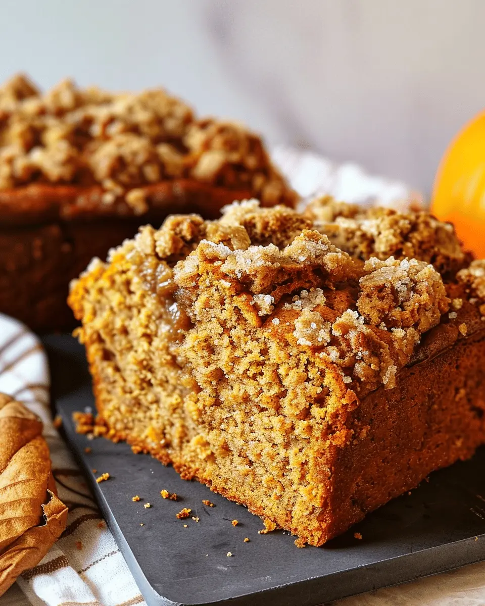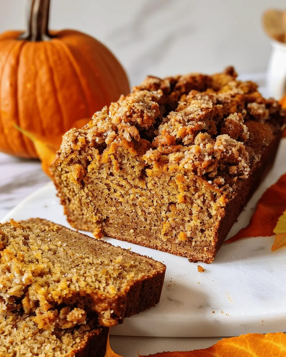 This indulgent pumpkin bread recipe features a delicious streusel topping that enhances its rich flavor and texture.