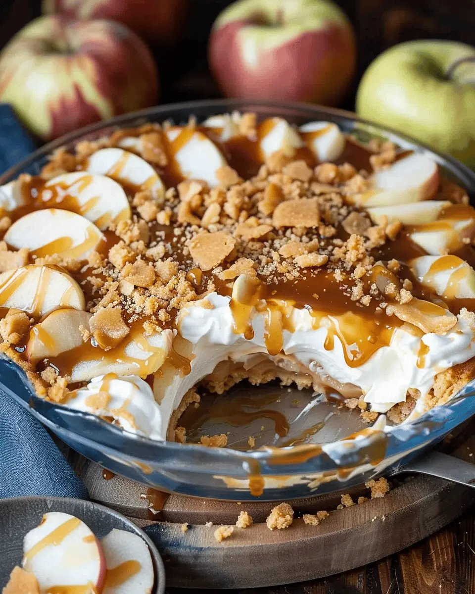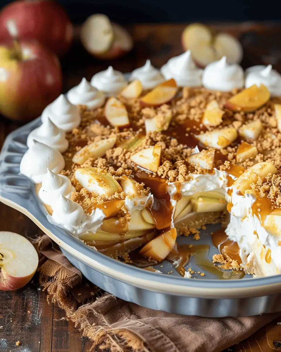 - Fold in the caramel sauce, diced apples, and whipped cream until just combined.