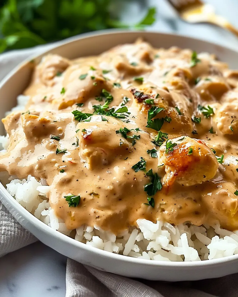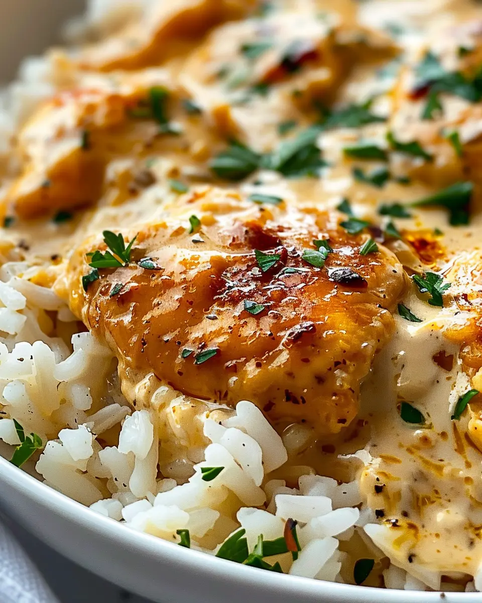 - Layering: Start with a base of rice, layer on your chicken, and spoon the creamy sauce generously on top. Garnish with fresh parsley for a pop of color.