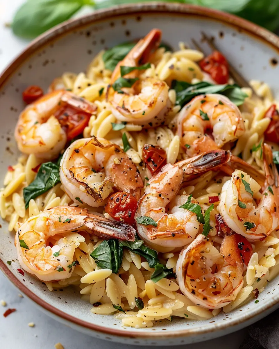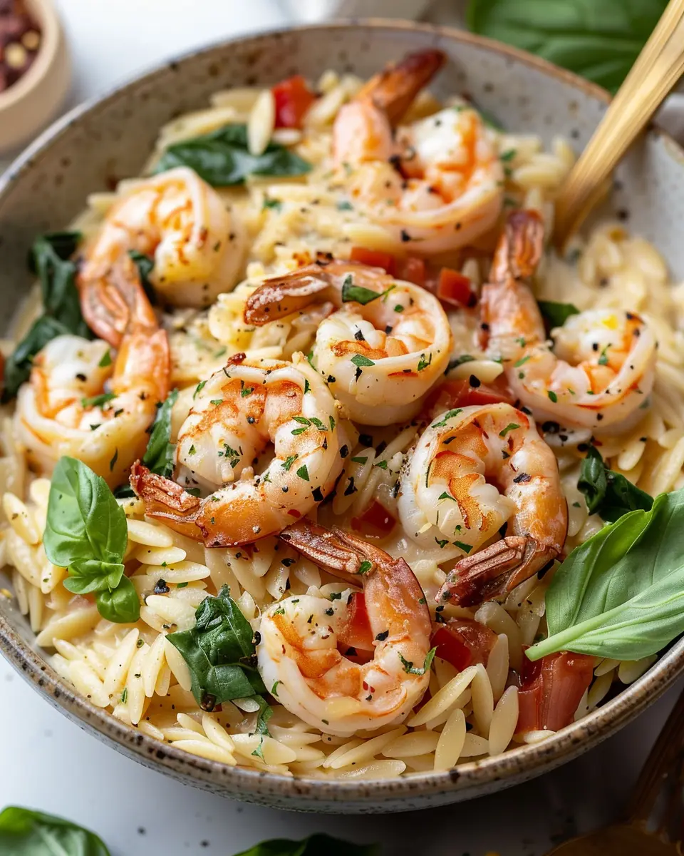 A rich and creamy dish that combines succulent shrimp with orzo pasta and a blend of Tuscan flavors.