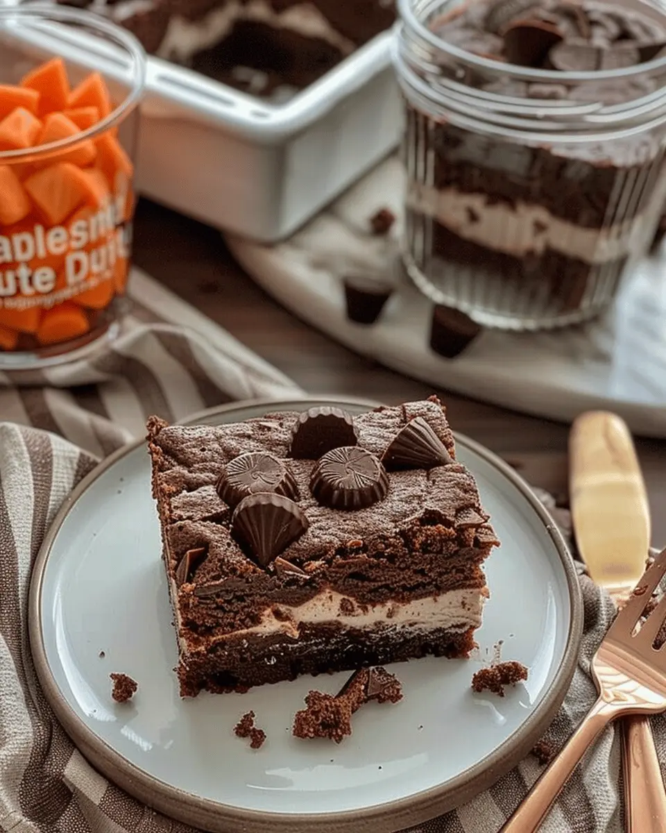 Bringing your easiest fudgiest peanut butter cup dump cake to the table can be just as fun as making it. Consider serving it directly from the baking dish for that homey look, or dollop individual servings into mason jars for a trendy take. If you’re feeling a bit more sophisticated, try layering the cake in clear parfait glasses with whipped cream and crushed peanut butter cups on top — it’s a feast for both the eyes and the palate!