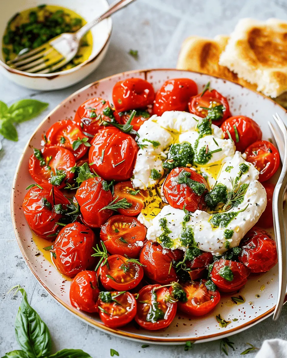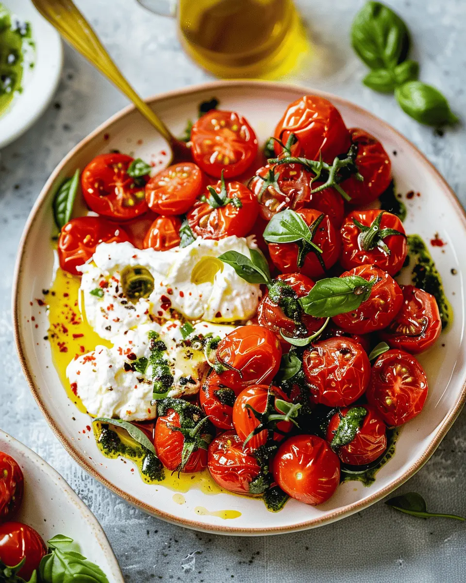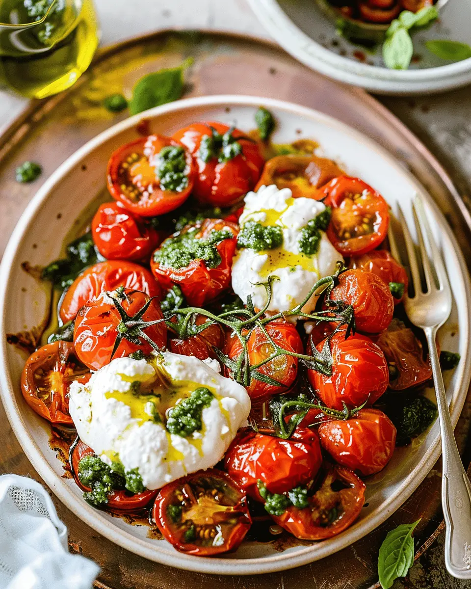 Discover the savory delight of roasted tomatoes paired with creamy burrata, perfect for any appetizer.
