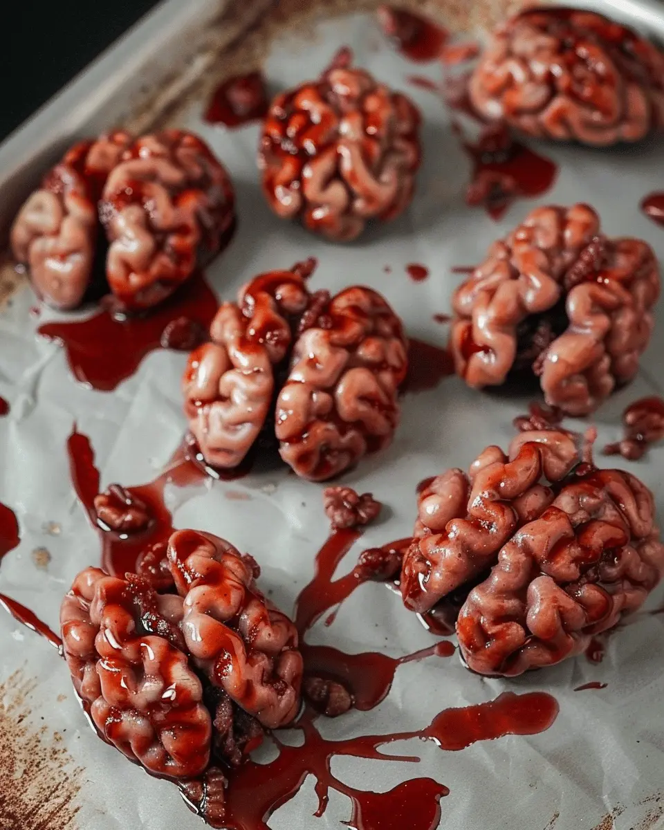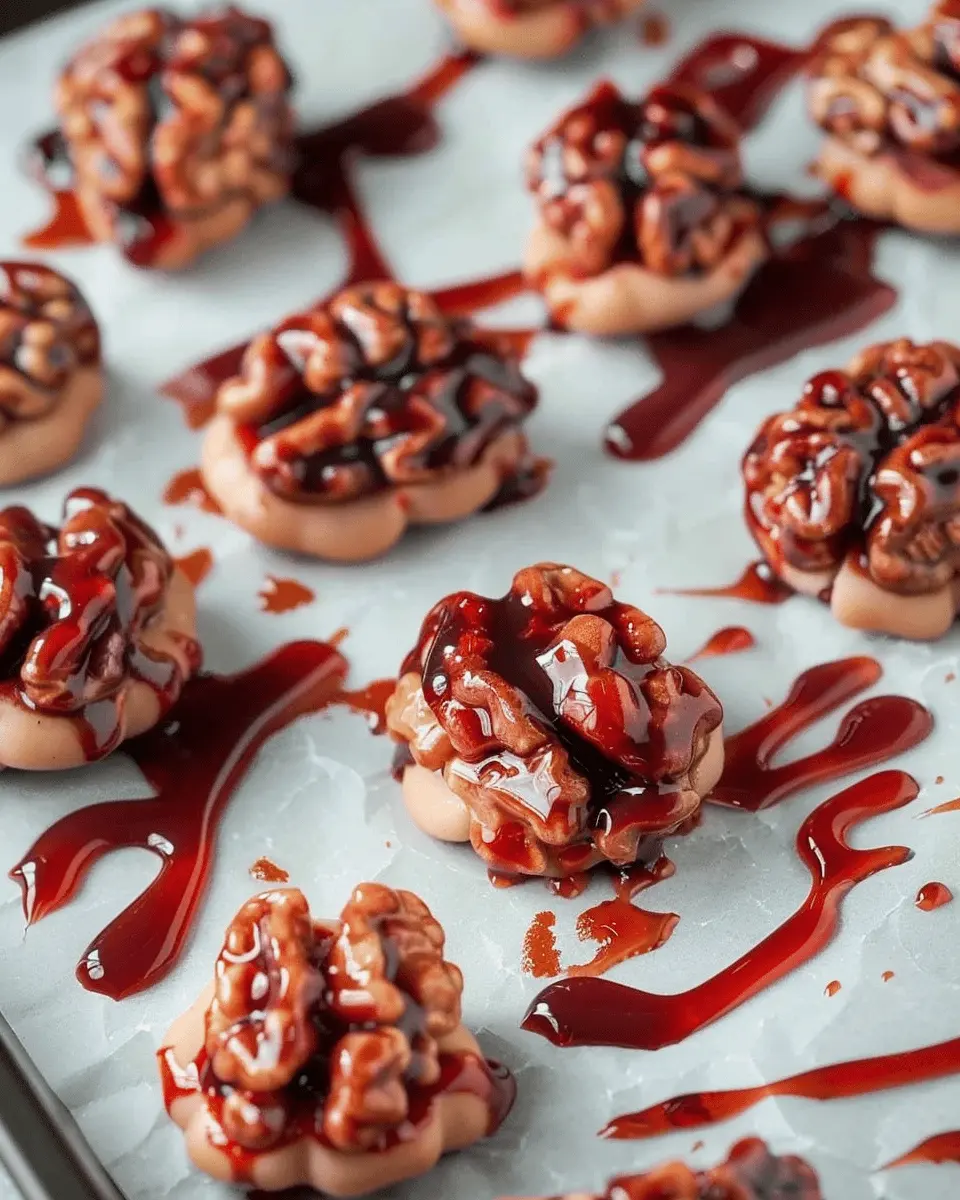 Delight your guests with these fun and indulgent Bloody Zombie Brains made from candied walnuts, perfect for Halloween celebrations.