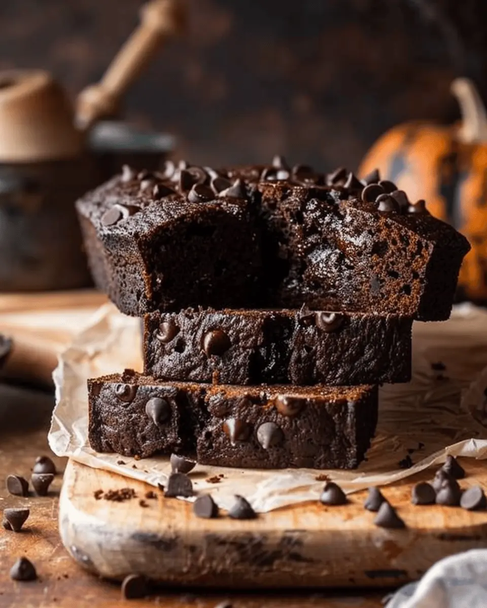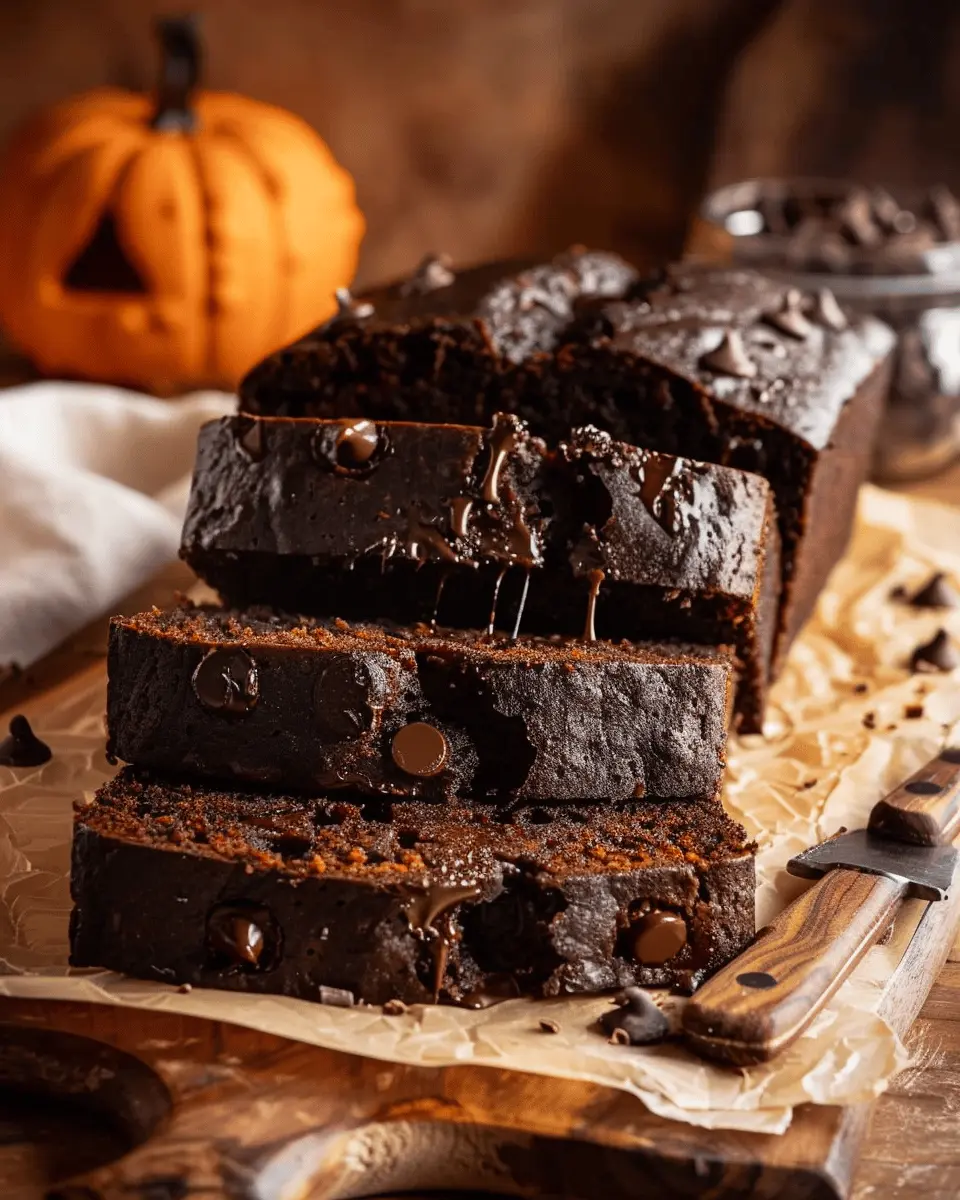 Indulge in the festive spirit with this easy and moist chocolate pumpkin bread, perfect for Halloween gatherings and treat tables.