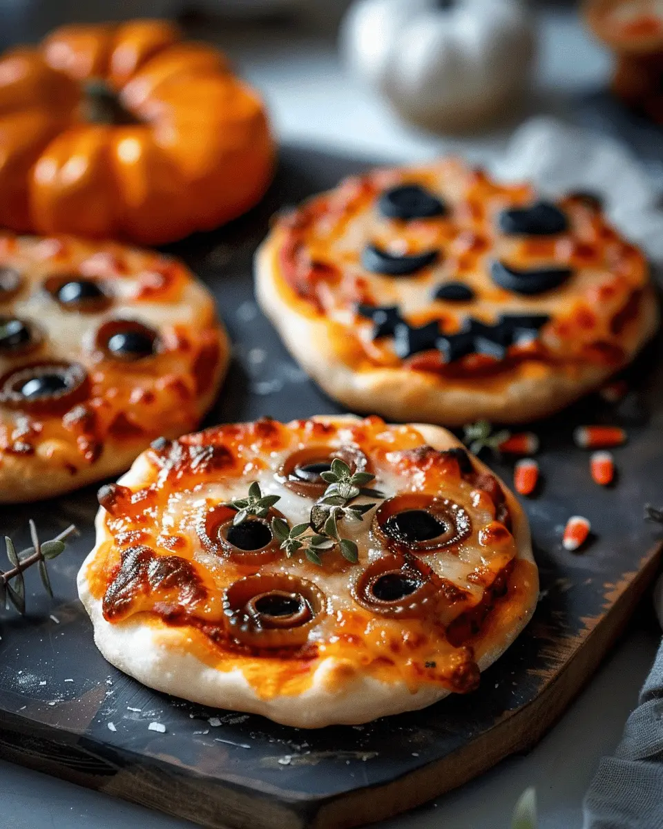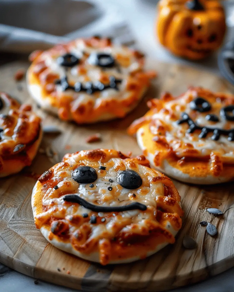 Keywords: Easy Halloween food ideas, Halloween Mini Pizzas, Spooky Mini Pizzas