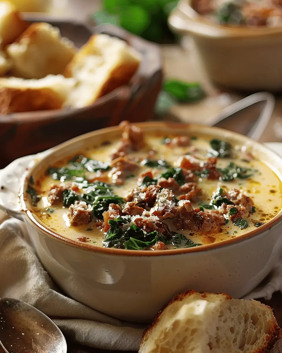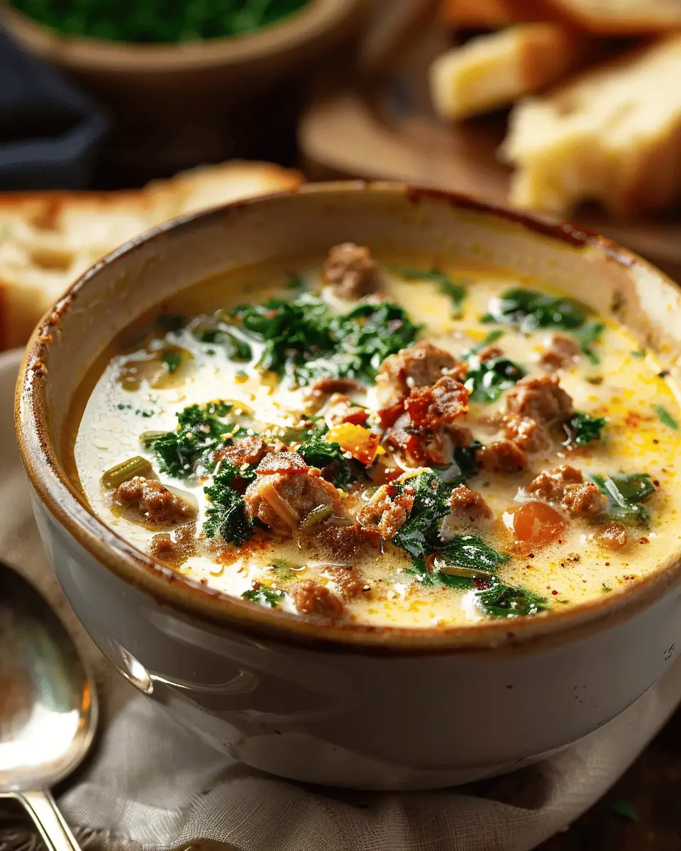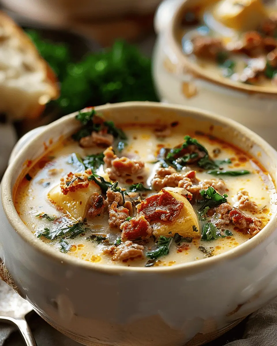 A beautiful, crusty bread complements your Zuppa Toscana perfectly, allowing you to soak up every last drop of that rich broth. A rustic sourdough or a fluffy focaccia is an excellent choice. Pair it with a light, refreshing salad—think mixed greens with a tangy vinaigrette to balance the soup’s richness. This combination not only enhances the flavors but also adds nutritional variety and freshness to your meal.