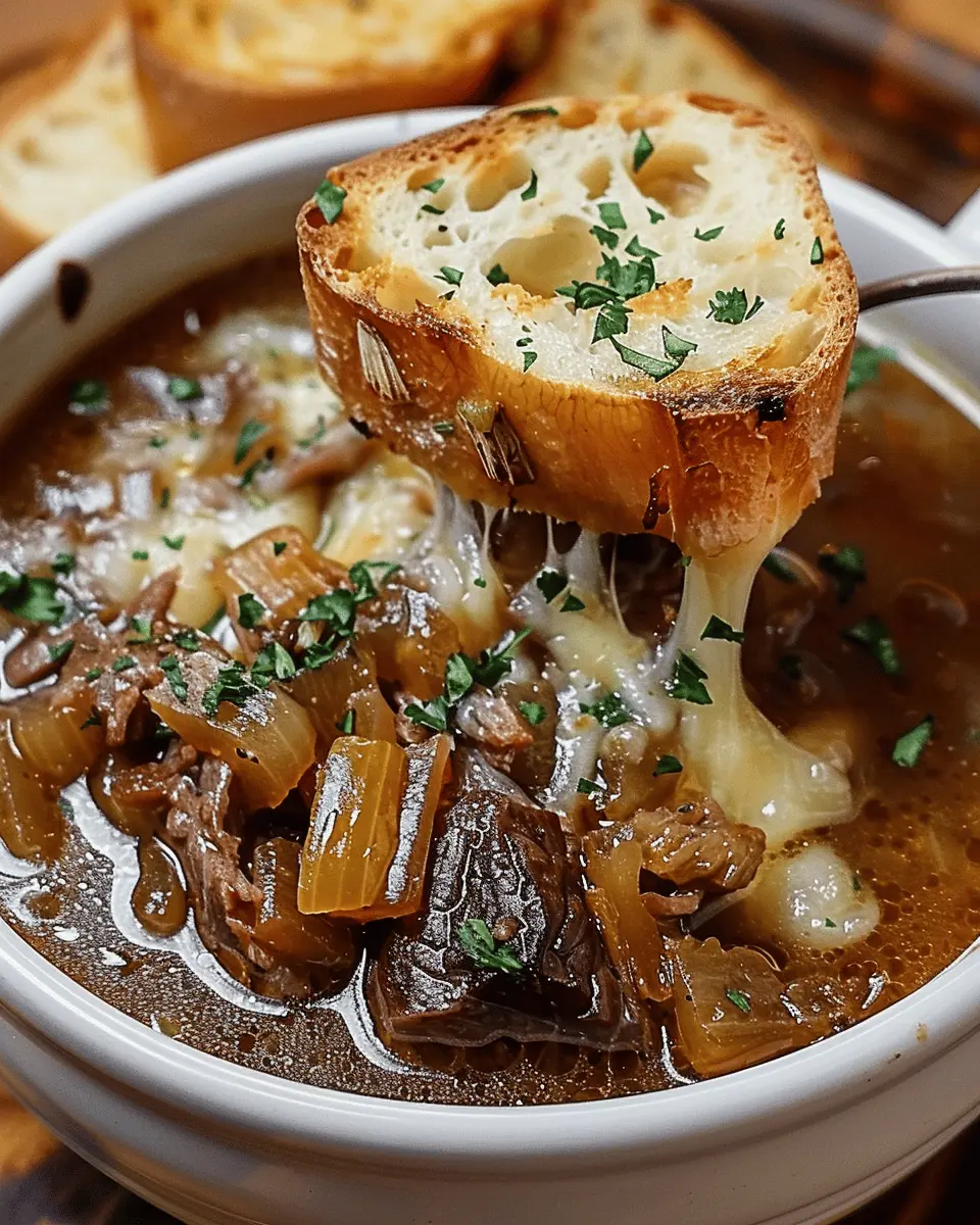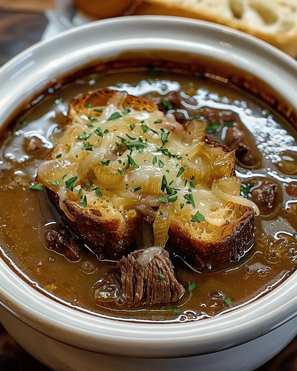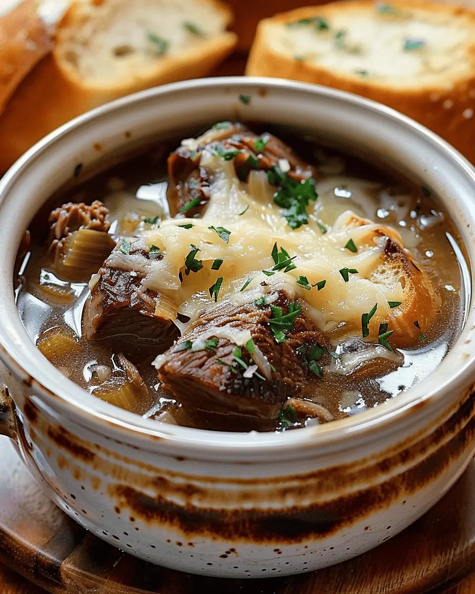 A comforting and rich soup featuring tender beef short ribs and sweet caramelized onions, perfect for any occasion.