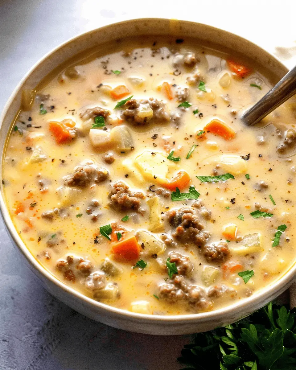 Once your soup is ready, stir in the shredded cheddar cheese and milk for that luscious, creamy texture. Top it off with freshly chopped parsley for a pop of color. Serve it warm and watch as everyone gathers around the bowl, eager for a taste of your amazing cheeseburger soup!