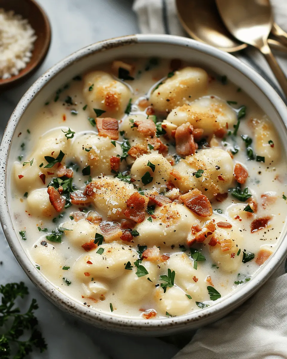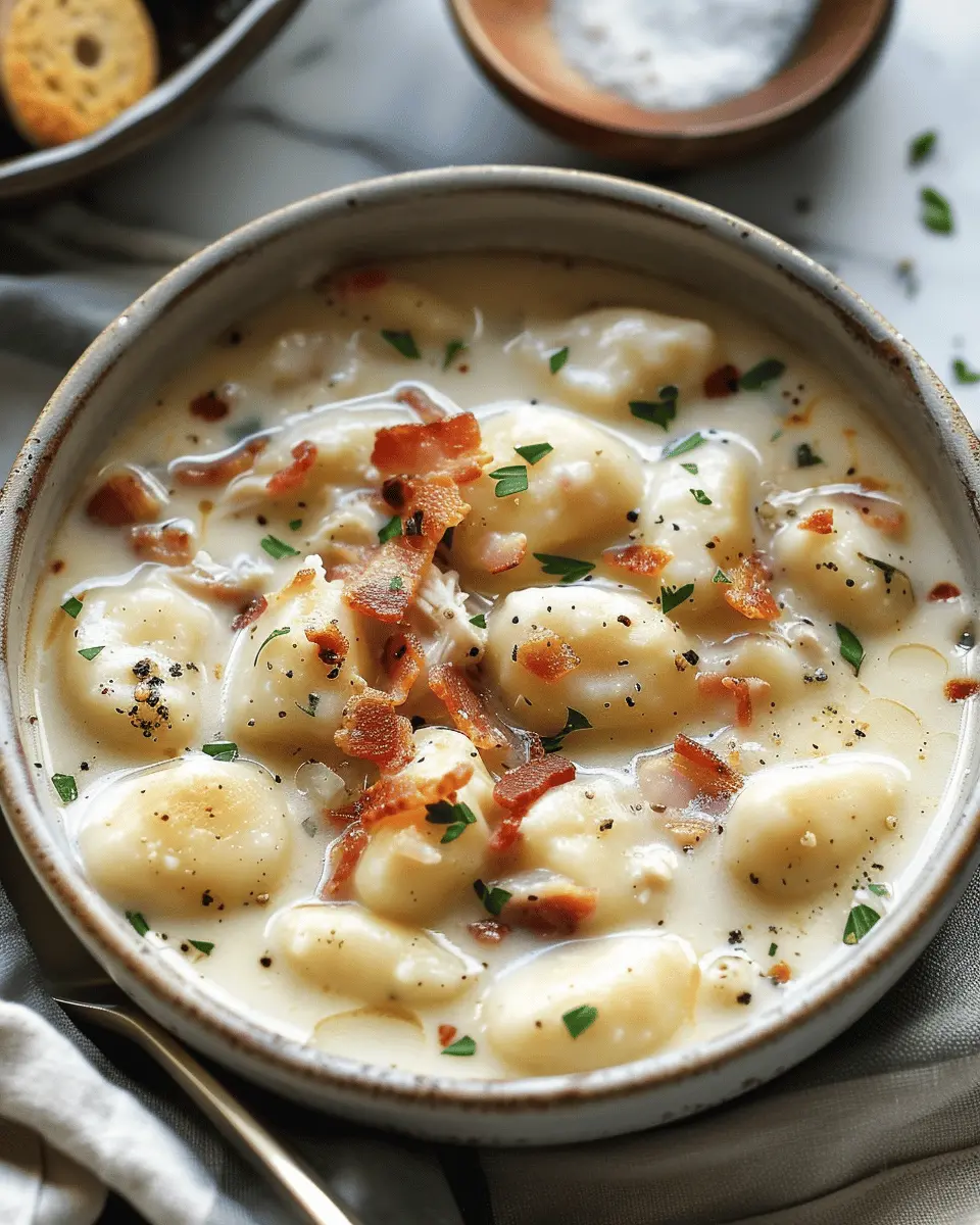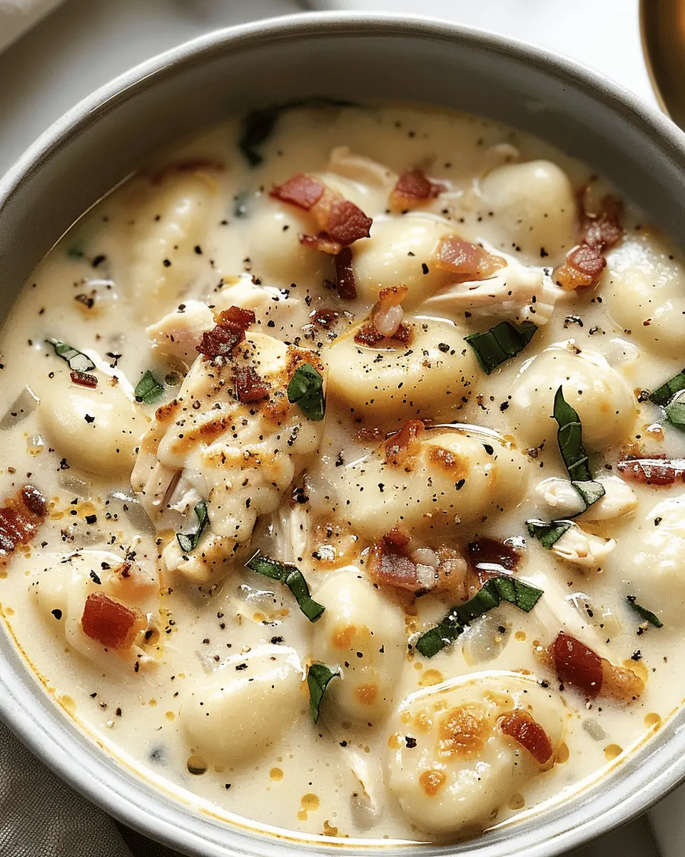 Indulge in this creamy and rich soup that combines the flavors of chicken and turkey bacon with tender gnocchi for a comforting meal.