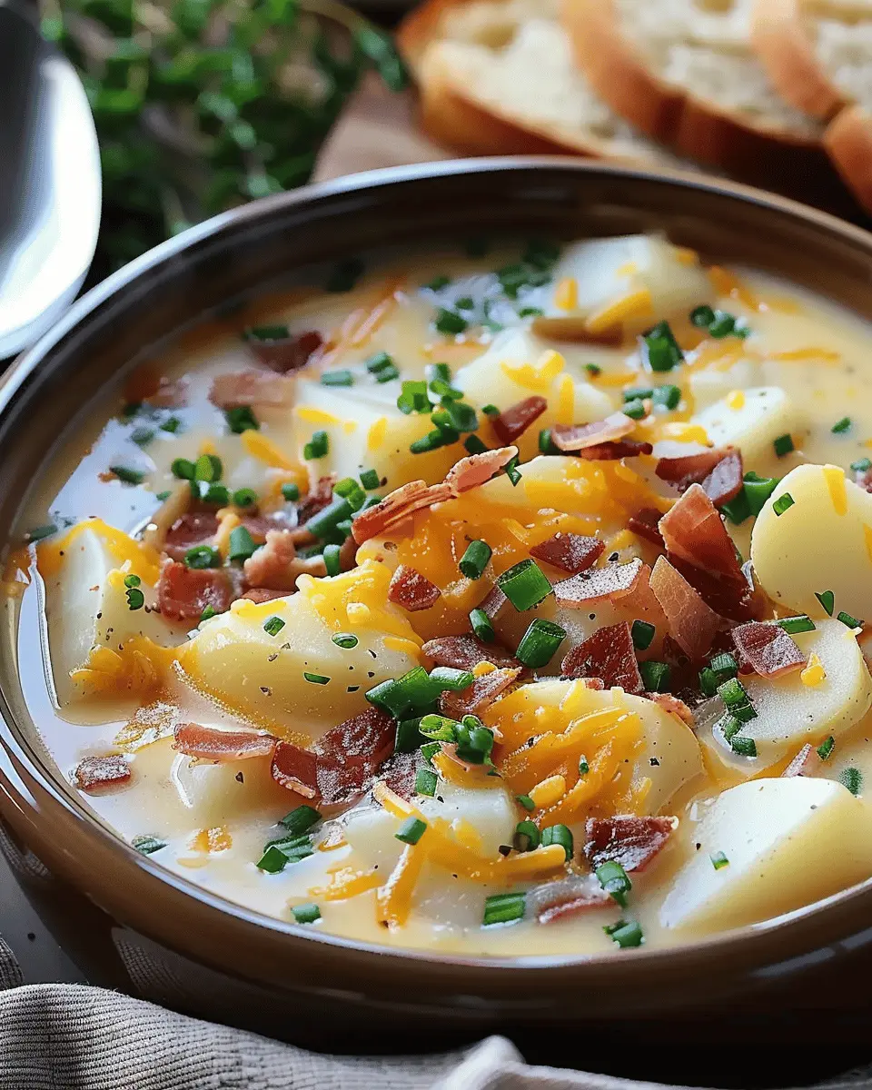 - Serve garnished with crumbled turkey bacon, remaining cheese, and chives.