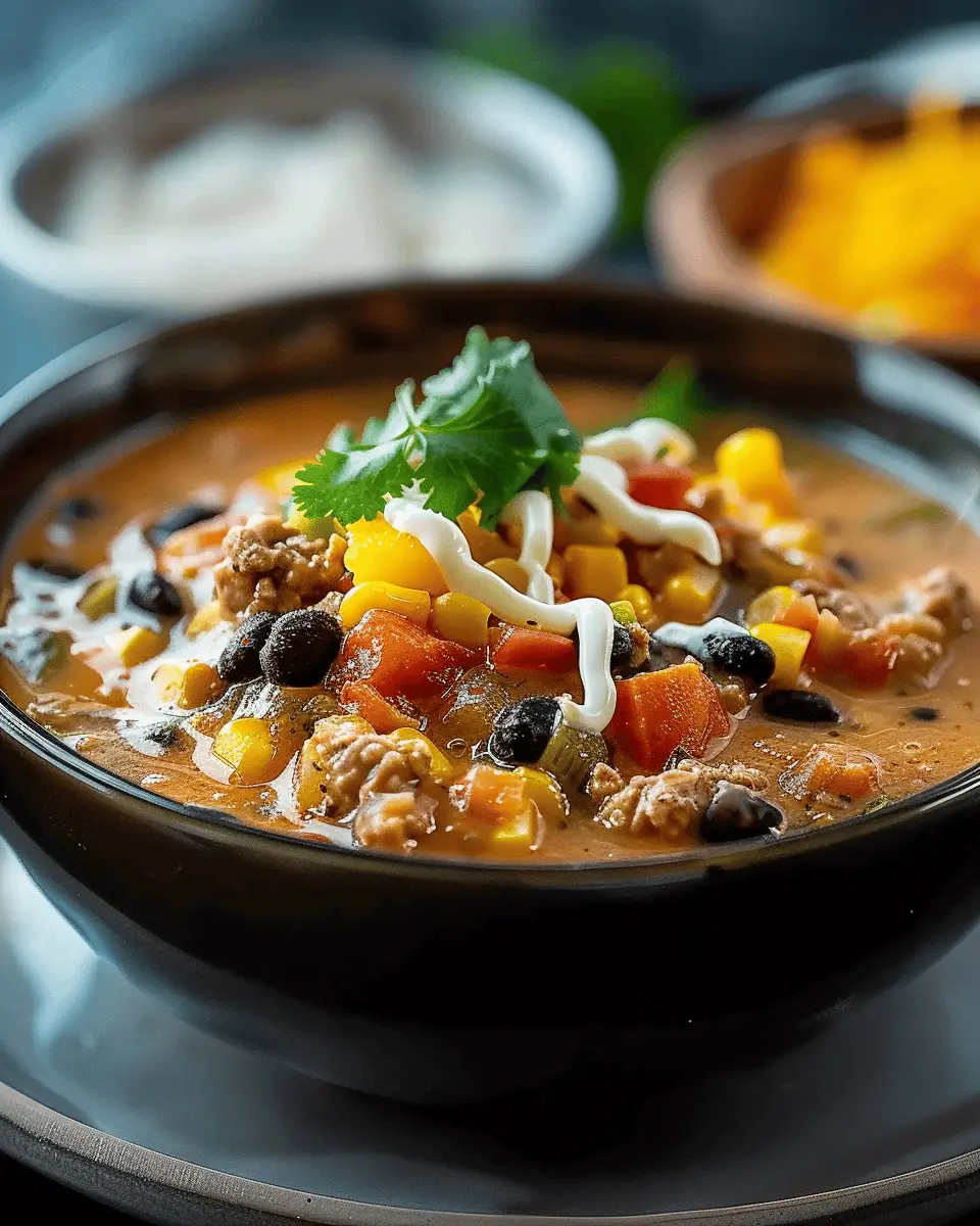 A delicious and hearty creamy taco soup recipe featuring high protein ingredients like turkey bacon and chicken ham.