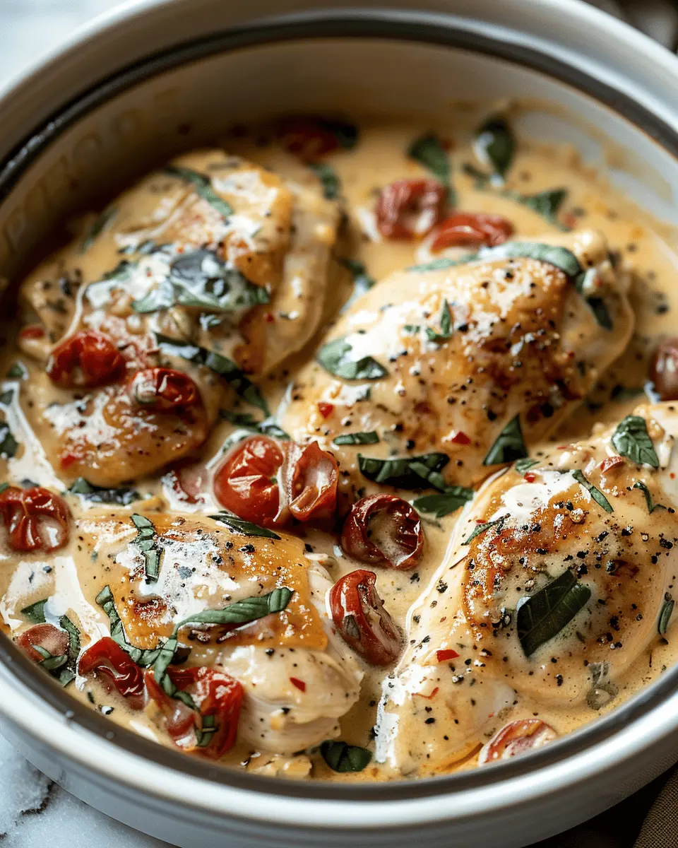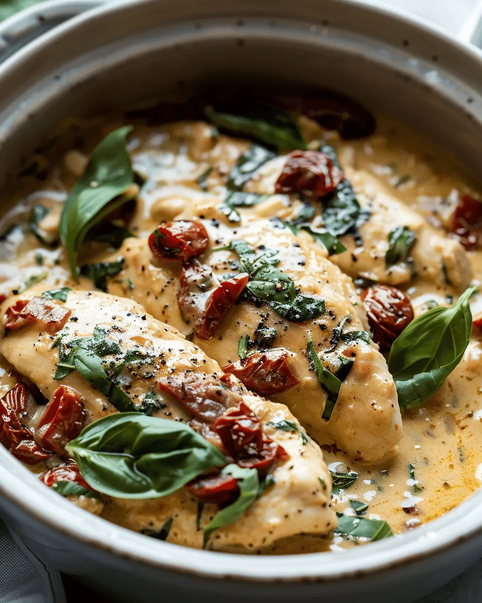 - Layering Ingredients: Place the chicken first, followed by the garlic and sun-dried tomatoes, then pour the broth and cream to keep everything moist.
