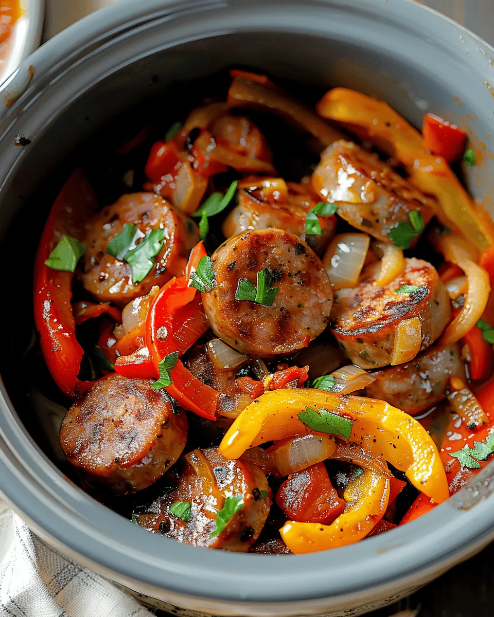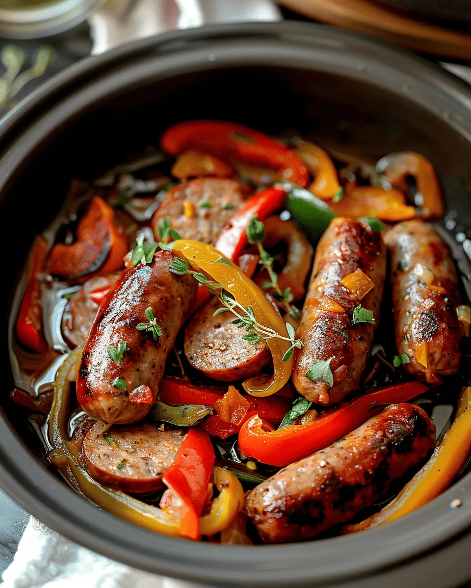 A delicious and easy recipe for summer featuring Italian sausage and peppers, cooked in a slow cooker.