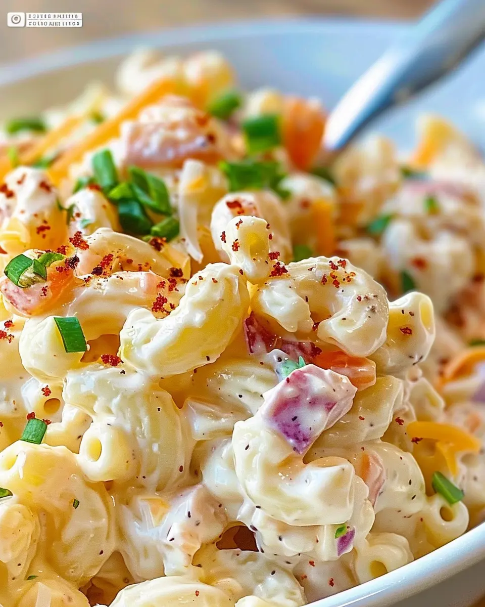 A delicious Hawaiian-inspired macaroni salad featuring turkey bacon and chicken ham.