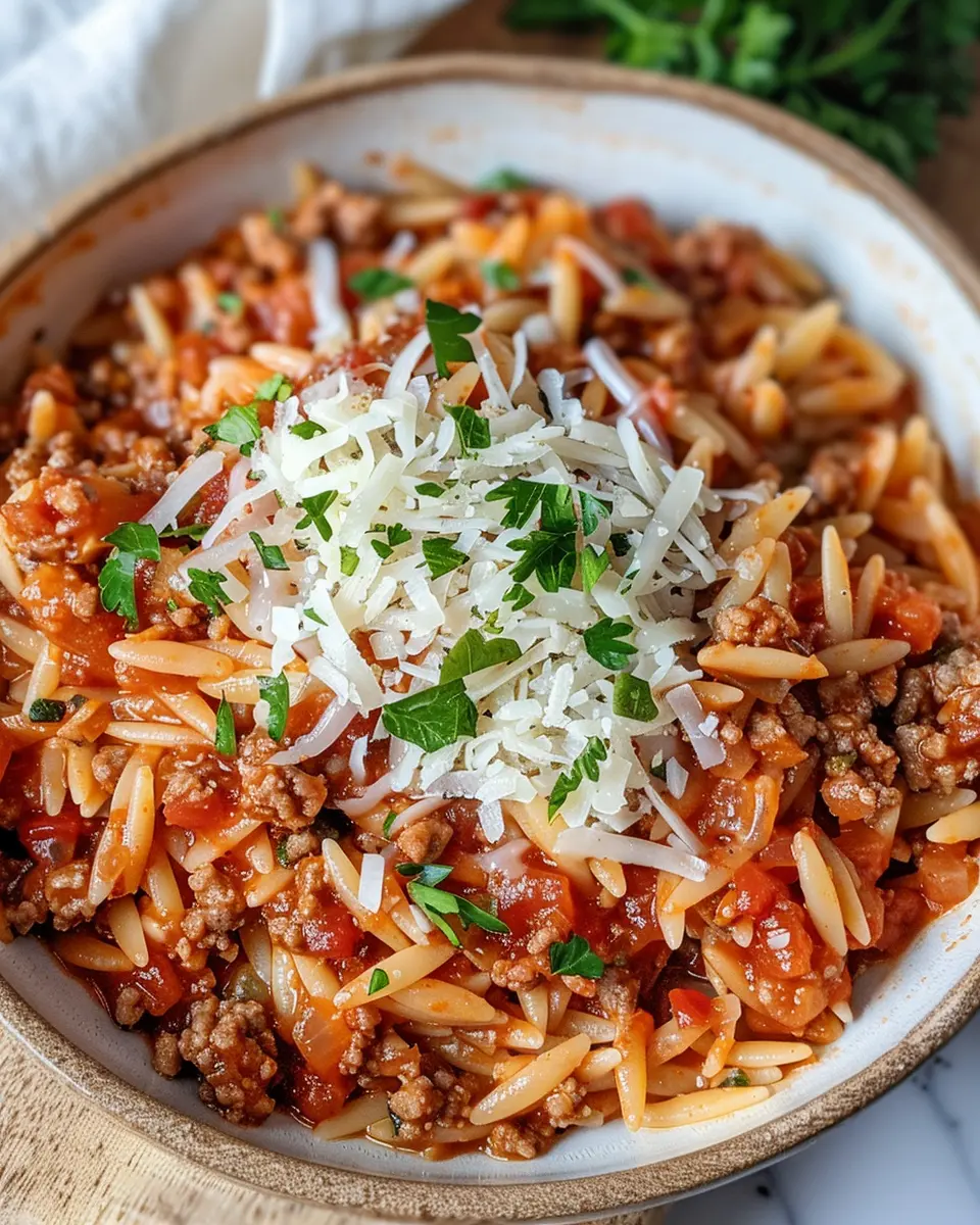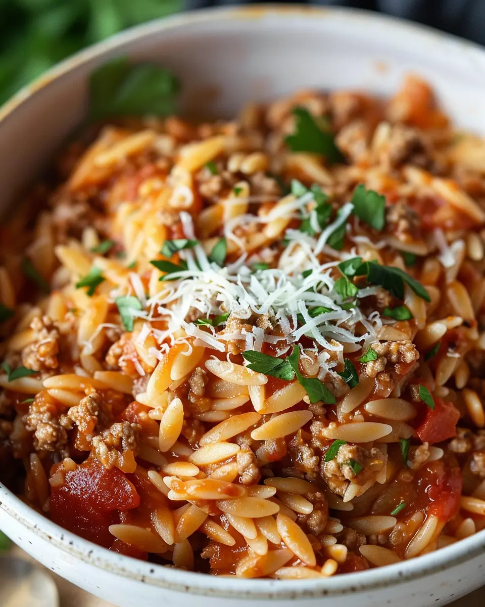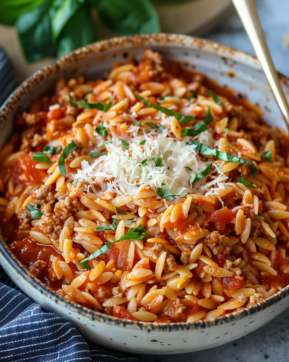 A hearty dish combining ground turkey and orzo in a rich tomato sauce, perfect for a comforting dinner.
