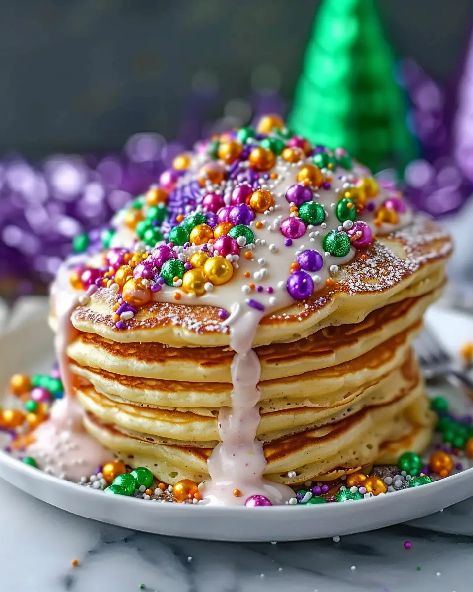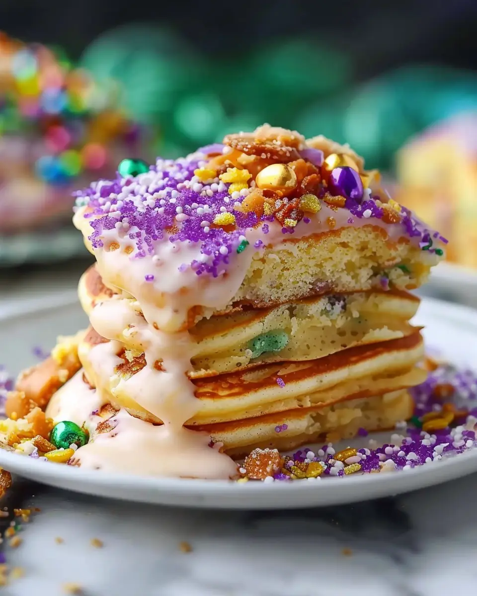 These pancakes aren’t just a feast for the palate; they’re a visual treat and a perfect way to celebrate with family and friends. So, what are you waiting for? Get cooking and enjoy this Mardi Gras-inspired morning delight!