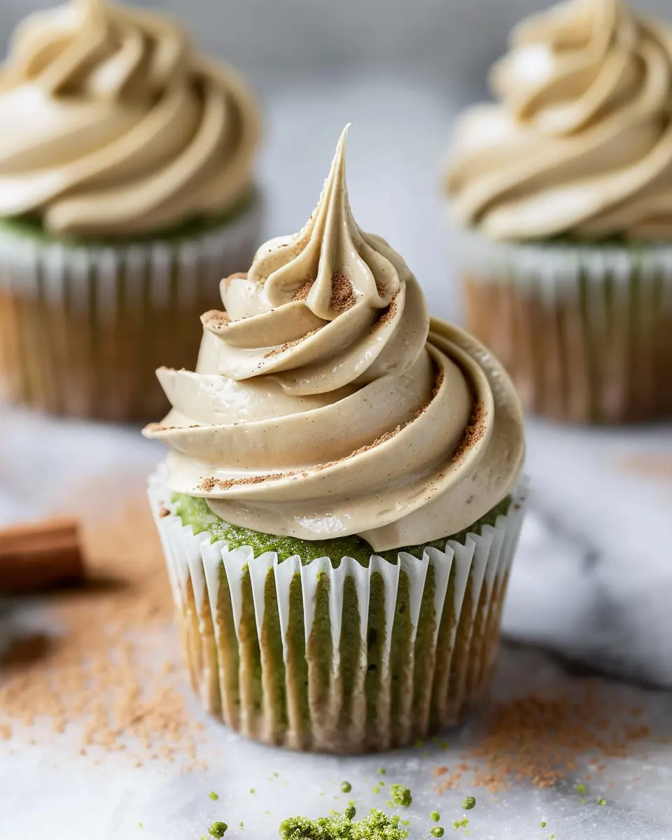 These matcha cupcakes are a delightful treat topped with a rich cinnamon buttercream, perfect for any occasion.