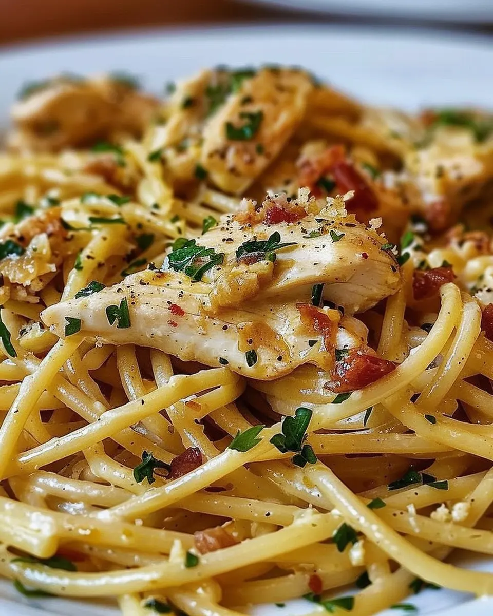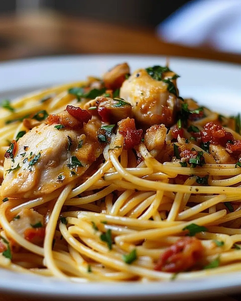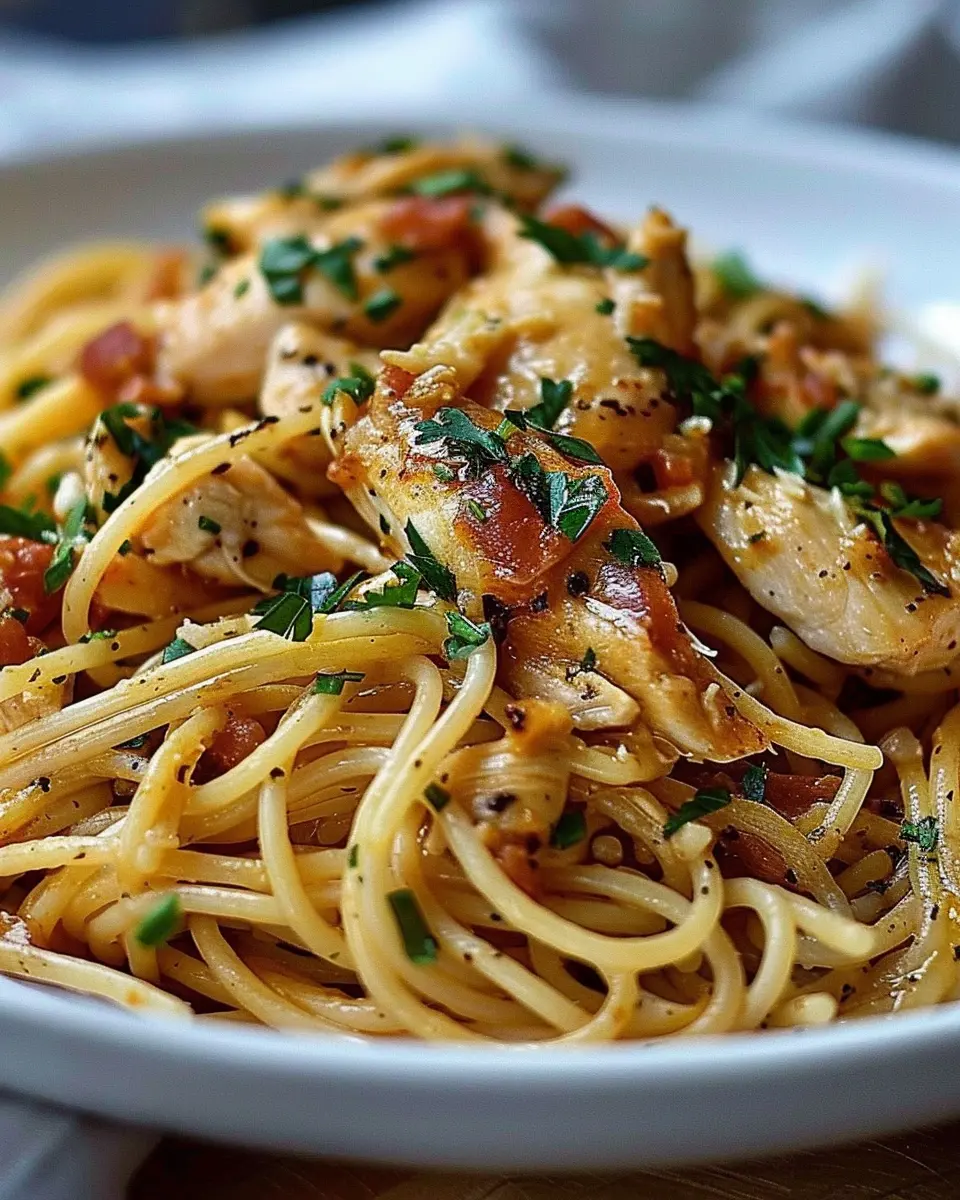 • Layer the Ingredients: Place the spaghetti first, then add the chicken on top, finishing with a sprinkle of fresh parsley or a drizzle of olive oil.