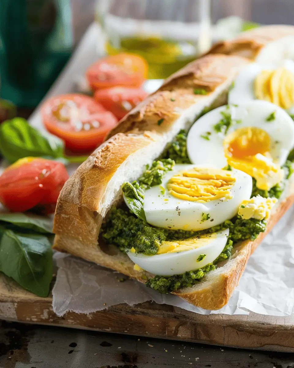 Enjoy a delicious and nutritious pesto and egg baguette sandwich that’s perfect for lunch!