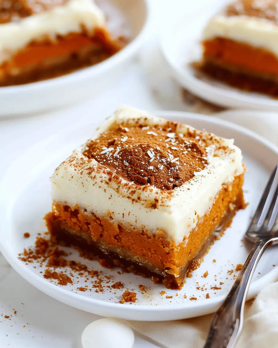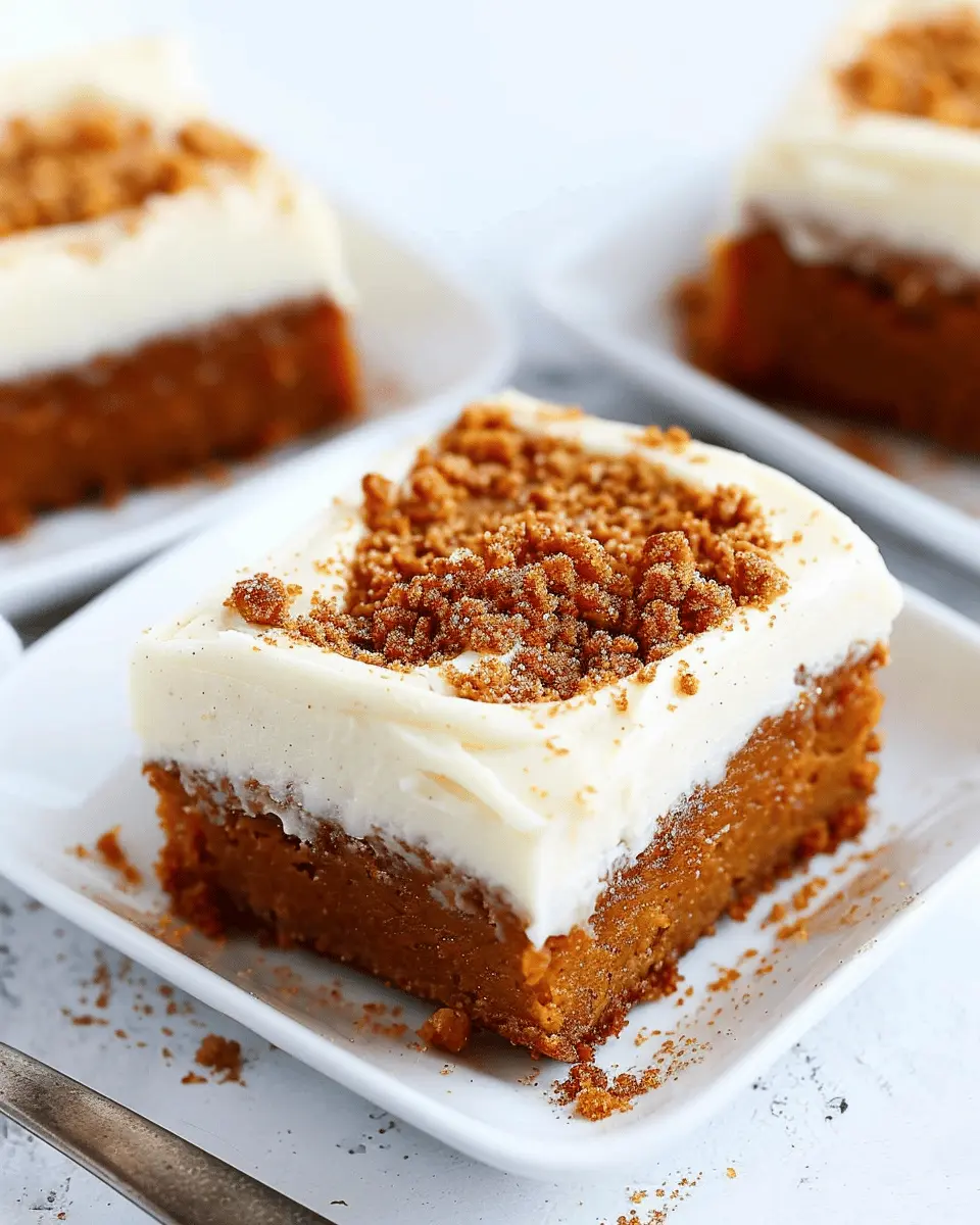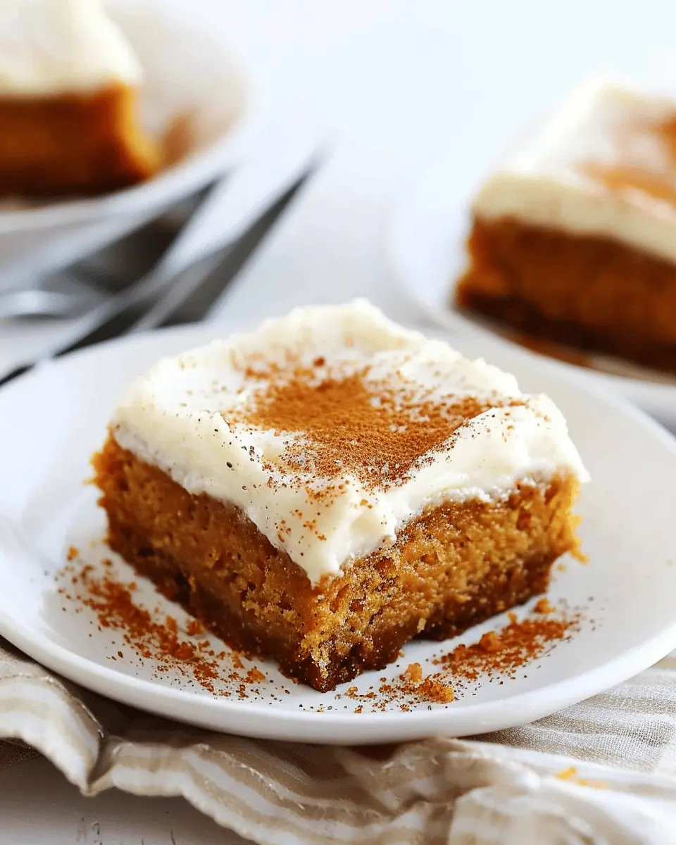 Make your pumpkin bars shine by serving them on a rustic wooden board. Cut them into neat squares and dust with powdered sugar for a touch of elegance. You can also drizzle extra cream cheese frosting over the top or garnish with candied pecans for added texture.