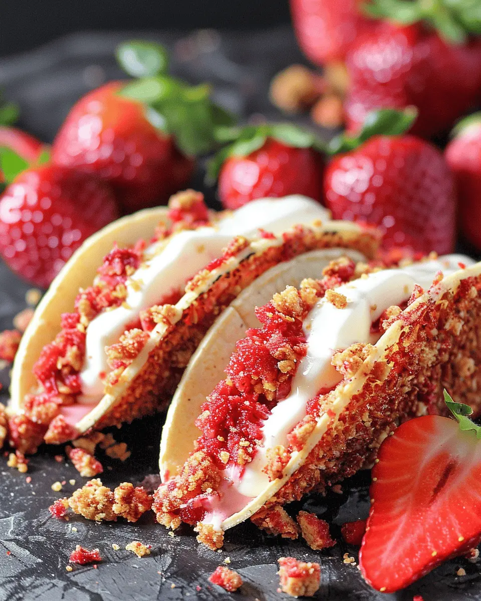 Experience the delicious fusion of strawberry, cheesecake, and tacos with this indulgent recipe that combines creamy filling and a crunchy topping.