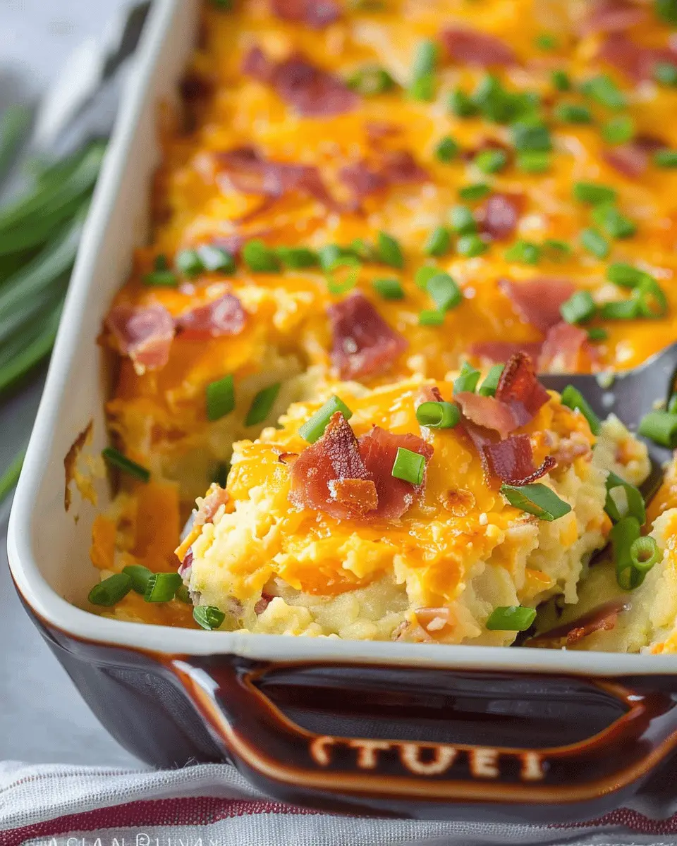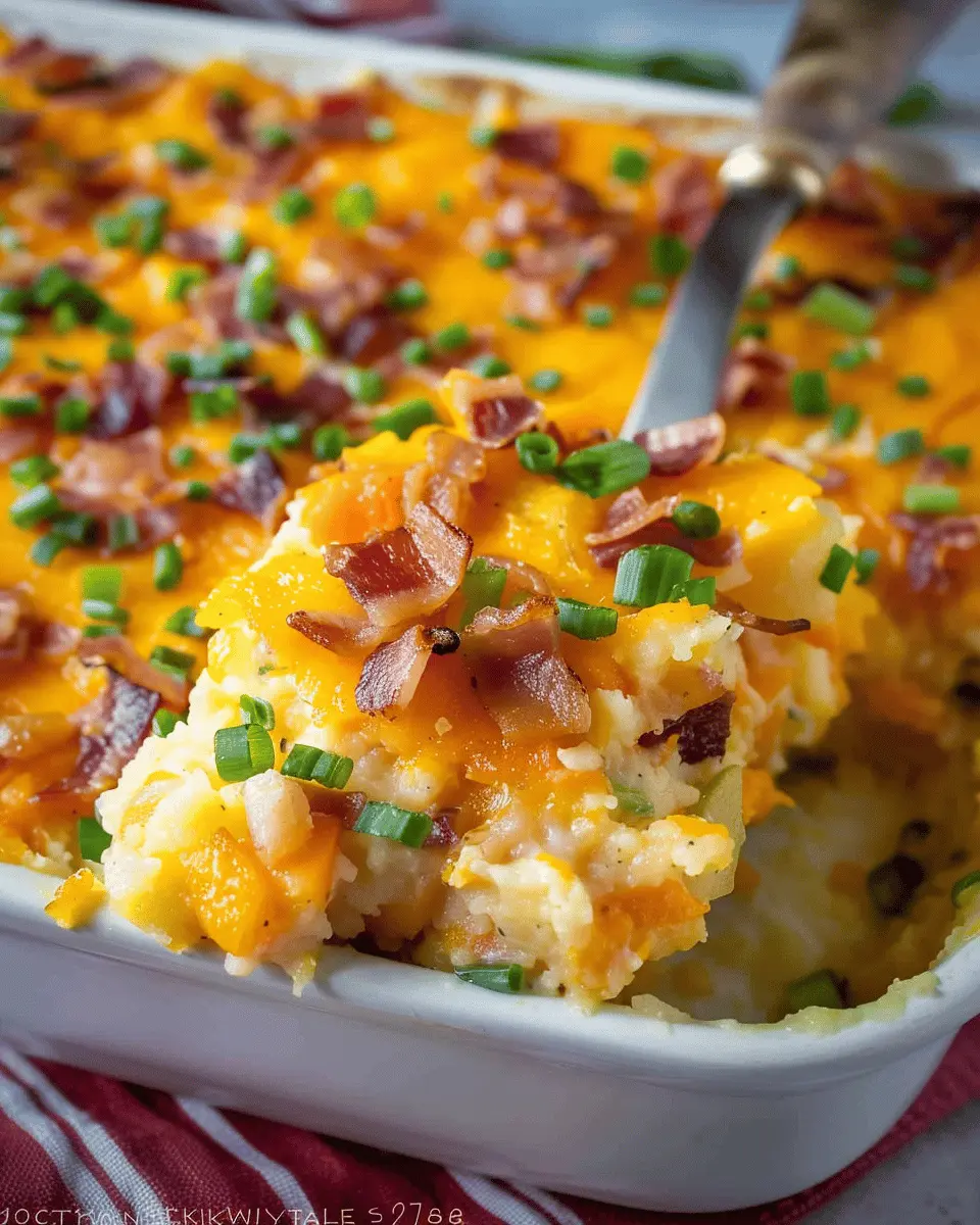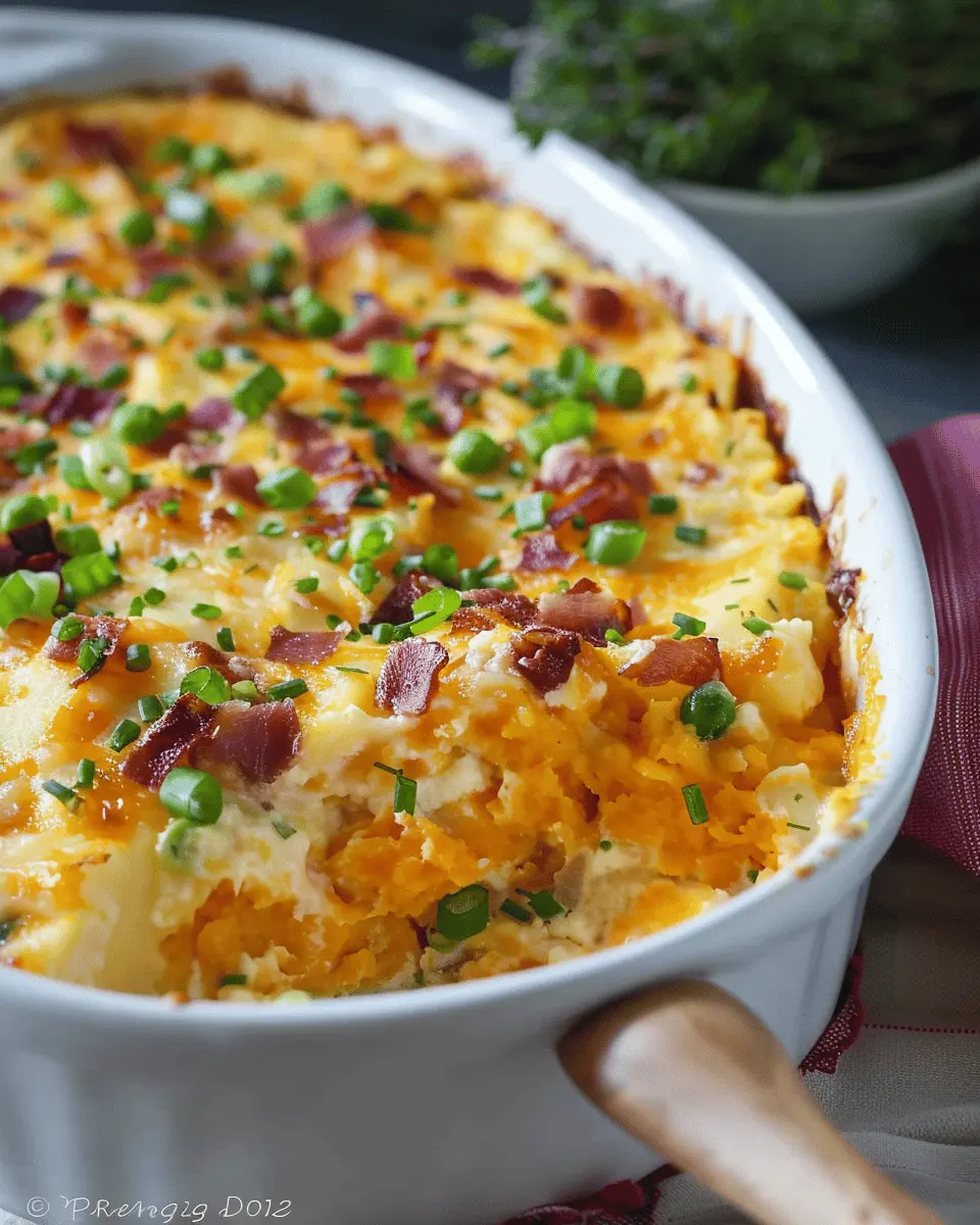 This Loaded Twice Baked Potato Casserole combines the sweetness of sweet potatoes with the classic flavors of a comforting casserole.